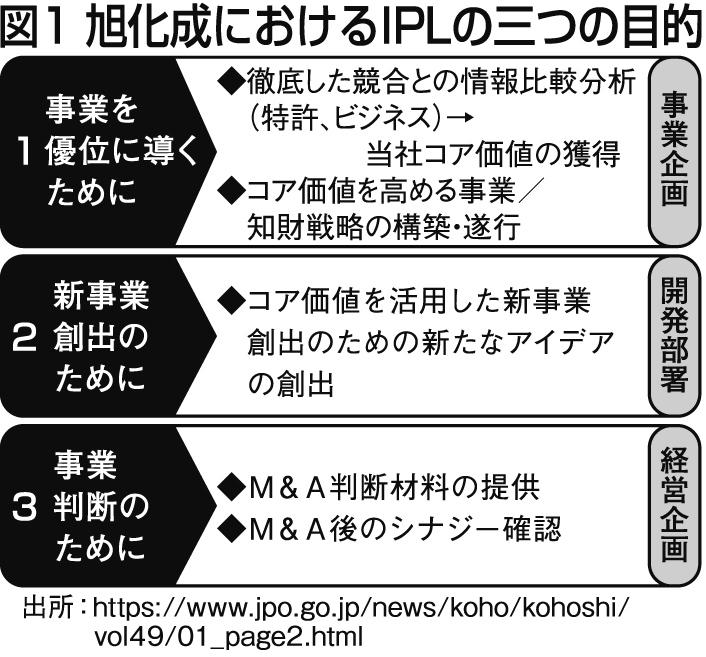 IPランドスケープのような知財情報分析・活用に限らず、情報分析を行う際に最も重要なポイントは目的を明確にすることである。図1に示すように旭化成では「事業を優位に導くために」「新事業創出のために」「(M&Aなどの)事業判断のために」の三つの目的を設定しており、一つ目は既存事業の強化、二つ目は新規事業創出に該当する。