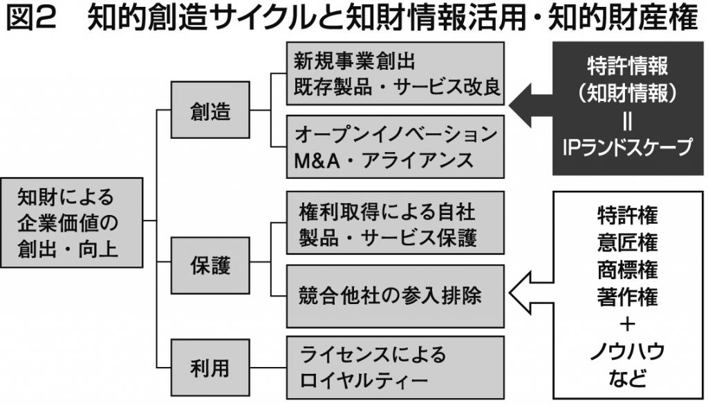 小泉政権下で約20年前に提唱された知的創造サイクル(創造→保護→活用)を図2に示す。それまでの知財活動は出願・権利化に代表される保護・活用フェーズにおける権利としての知的財産“権”であった。もちろんこれらの知財活動の重要性が減じることはないが、今後企業に求められているのは創造フェーズにおける知財情報の活用、つまりIPランドスケープである。あらゆる製品・サービスがコモディティー化する中で、企業にとって既存製品・サービスの改良だけではなく、自社保有技術に基づいた新規事業の創出、そして垂直統合的に1社単独で製品・サービス展開を図ることが困難になってきているため、オープンイノベーションを実現することが喫緊の課題と言える。これらの創造フェーズにおける諸活動にも知財情報は非常に有益な情報である。