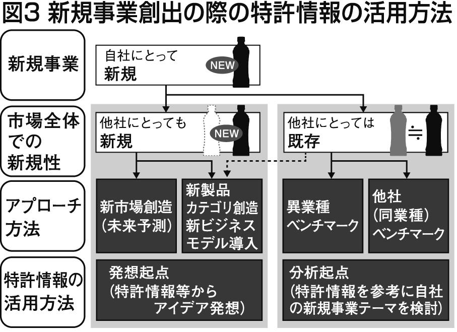 ここでは一例として新規事業創出の際の特許情報の活用方法について説明する。図3に示す通り、新規事業は自社にとっては当然のことながら新規であるが、他社もまだ手がけていない新規テーマであるか、または同業種・他業種問わず他社が既に手がけている既存テーマであるかで特許情報の活用方法は「発想起点」と「分析起点」に大別される。