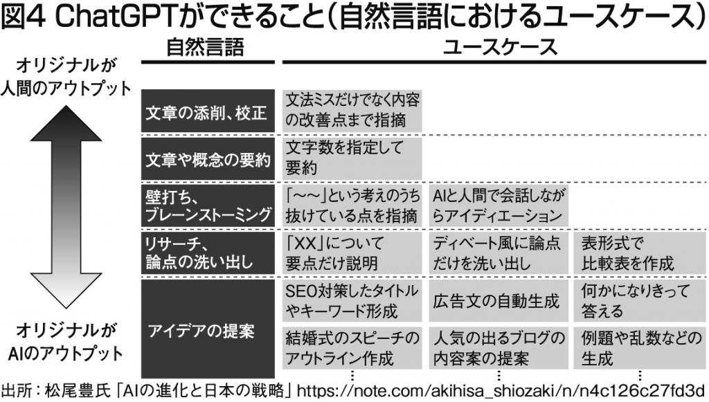 最後に、22年11月末に登場したChatGPTに代表されるジェネレーティブAI(生成人工知能)が今後の企業における知財情報分析・活用に与える影響についても触れておきたい。既にChatGPTを利用された方も多いかと思うが、図4に示すようにさまざまなタスクをこなすことができる。ChatGPTを公開した米オープンAIはテキストだけではなく画像入力にも対応したマルチモーダルのGPT4を23年3月に発表しており(本稿執筆時点で一般ユーザーは利用できない)、知財業務へも非常に大きなインパクトを与えることは間違いない。