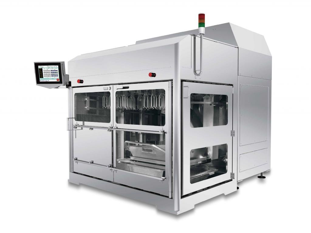 バットは片手で着脱できるシンプルな構造と防水性の高い2軸パラレル機構の採用で清掃時間を3分の1にし、作業負担軽減と高い清掃性を両立させている。専用バット台車はフリーベアリング構造で搬送台上をスムーズに移動、約20秒でバット交換による食材追加が可能であり、作業性と省人化・稼働率向上を実現している。1人で2台の運用を想定している。