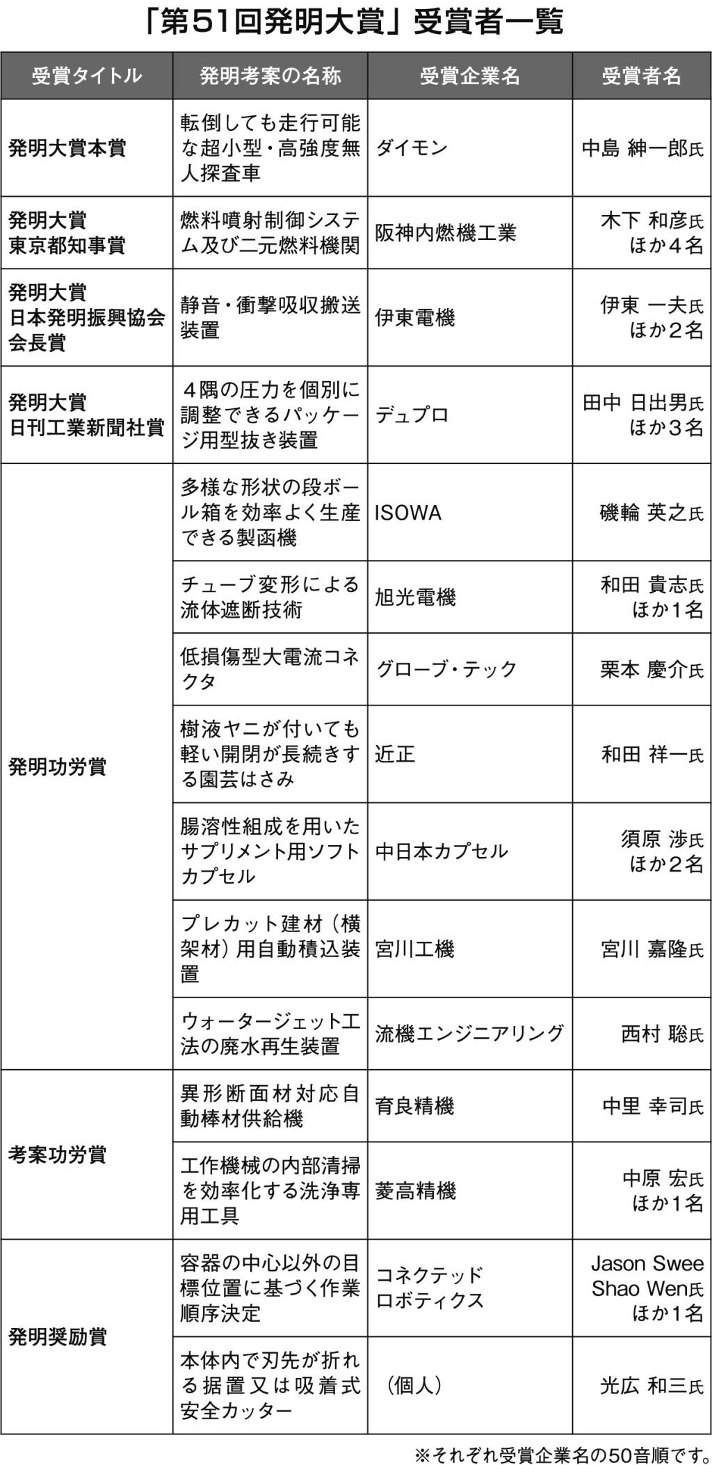 日本発明振興協会(東京都渋谷区、加藤忠郎会長)と日刊工業新聞社共催の「第51回(2025年度)発明大賞」受賞製品・技術が6日に発表された。発明大賞本賞や、発明大賞東京都知事賞など計15件が受賞した。表彰式は13日に東京都港区の明治記念館で行われる。日本のモノづくり現場の工夫を可視化するとともに、中小企業や個人発明者の成果発表の機会となる。