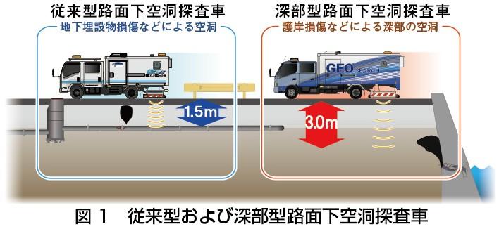 これまで空洞の早期発見には地中レーダーを搭載した路面下空洞探査車などが用いられてきた。これは、電磁波の反射を利用して地下構造を可視化する技術だ。しかし、従来の探査車は主に舗装直下の浅い深度(最大約1・5メートル)の空洞検知を目的としており、深部に起因する空洞は地表面近くまで発達しなければ検知が困難という課題があった。