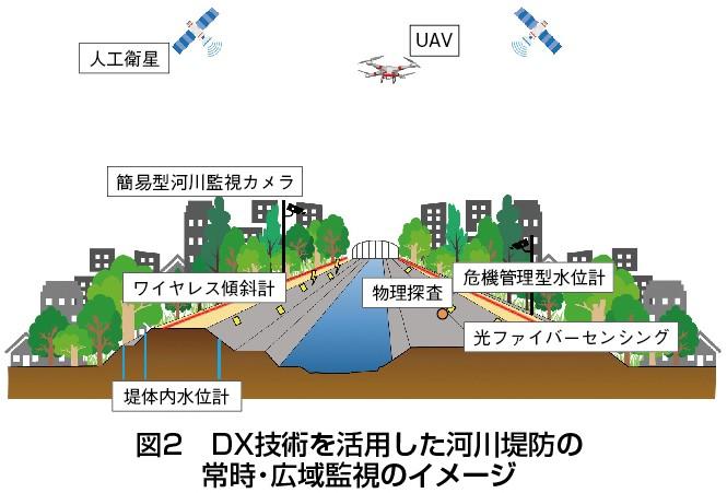 道路の深部空洞や長大な堤防の弱部は、従来の手法では早期発見が困難なインフラ災害リスクだ。「深部型路面下空洞探査車」と「ダークファイバーを用いた堤防監視技術」は、それぞれの“壊れ方”を理解した上で、災害の予兆を的確に捉える新たな“測り方”である。これらを含めたさまざまなDX(デジタル変革)技術の活用によってインフラの状態を常時・広域監視することが標準となり、将来にわたって災害に強い安全で強靱(きょうじん)な社会を構築できることが期待される(図2)。