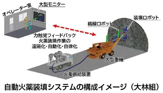 大林組は慶応義塾大学ハプティクス研究センターと共同で、力触覚を再現する技術「リアルハプティクス」の応用により、切羽直下での火薬装填作業の無人化を実現した。自動火薬装填システムに、起爆用爆薬の供給装置を搭載。従来は5人で行っていた装填作業を、切羽から50メートル離れた場所にいながら1人で実施でき、安全性向上と省人化を図れる。