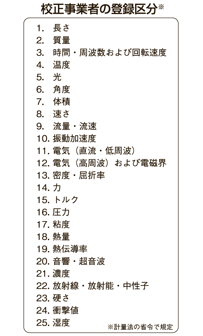 審査では、試験所・校正機関の能力に関する国際規格であるISO/IEC17025への適合が確認される。具体的には、品質マネジメントシステムの適切な運営、計測技術に関する要員の力量、校正の実施プロセス(計測プロセス)、計測のための環境(測定設備)、設備の維持管理(施設計測環境)などが評価の対象となる。登録事業者の区分として、長さや質量、圧力など25区分に分類されている(表)。