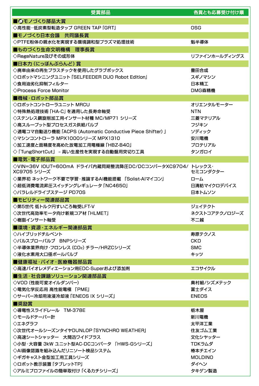 “超”モノづくり部品大賞は2003年に「モノづくり部品大賞」として創設した、日本のモノづくりの競争力の源泉である部品や部材に焦点を当てた表彰事業。08年から現在の名称となった。①機械・ロボット②電気・電子③モビリティー関連④環境・資源・エネルギー関連⑤健康福祉・バイオ・医療機器⑥生活・社会課題ソリューション関連—の6分野を表彰対象としている。受賞した部品はいずれも、わが国の産業・社会を支える重要な役割を果たしている。