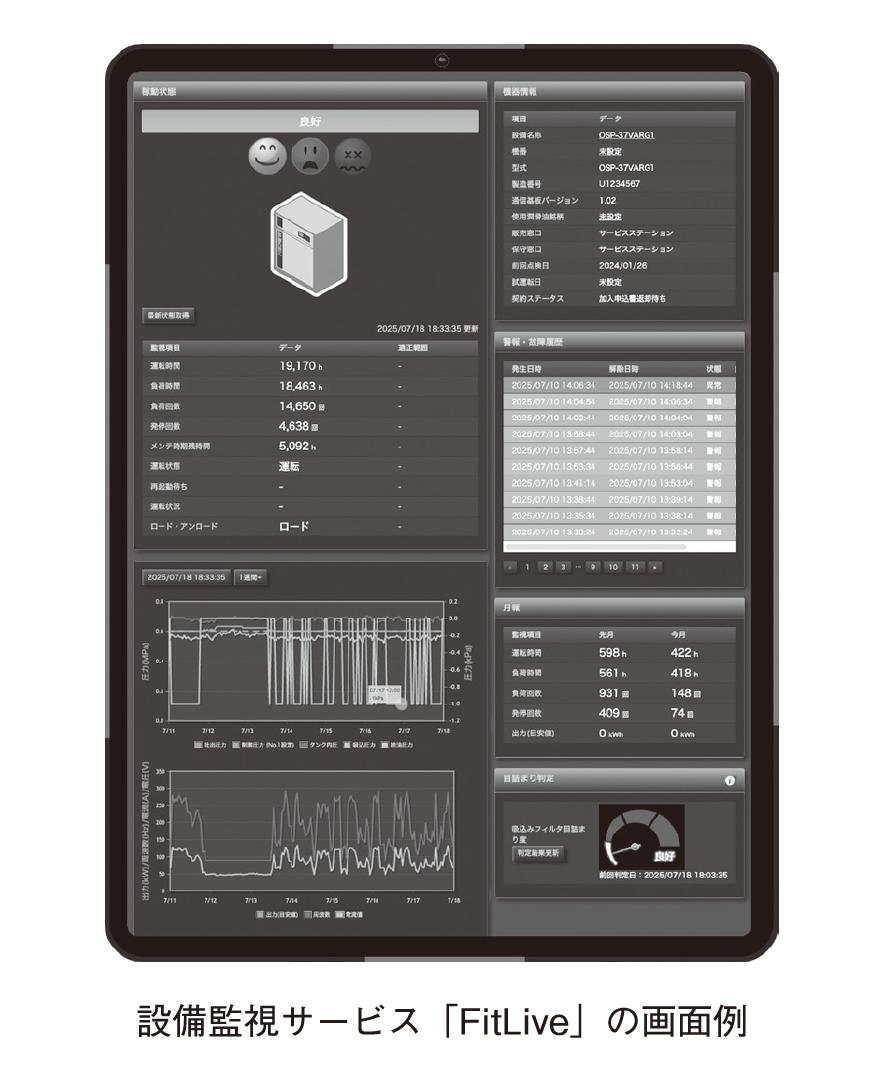 この課題に対し、当社は設備監視サービス「FitLive」を標準搭載する空気圧縮機のラインアップを拡充した。これにより、遠隔地から容易に稼働状況を把握できる環境を整えている。