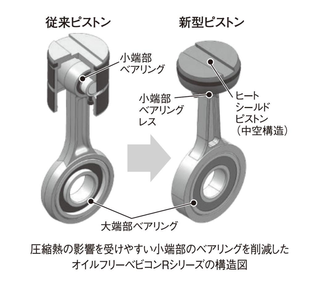 最新の代表製品として、高周囲温度対応オイルフリースクロール圧縮機Gシリーズ1・5キロ―3・7キロワットが挙げられる。従来のスクロール圧縮機ならではの静音性を維持しながら、周囲温度45度C環境下でも安定稼働できる。新搭載のヒートセーフティーモードを使用すると、温度に合わせて自動で設定圧を下げ、50度Cまで動作できる。オイルフリーベビコン(レシプロ)Rシリーズでは、タンクマウント型で50度C、パッケージ型で45度Cまでの安定運転を実現し、過酷な設置環境下でも高い信頼性を発揮する。