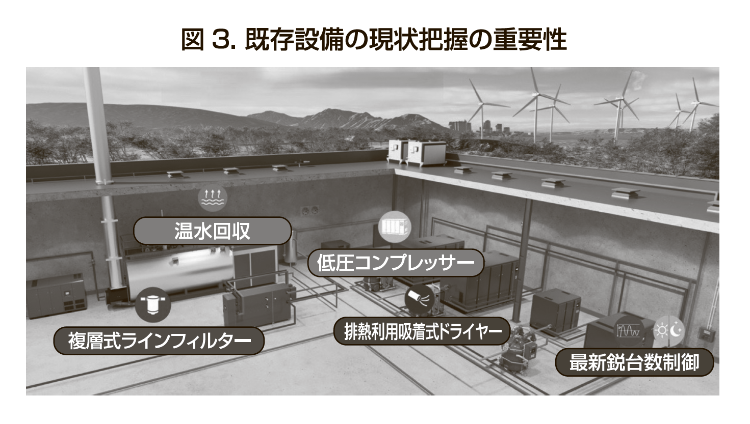 また、改善余地のある代表例として、温水回収、低圧コンプレッサー、排熱利用吸着式ドライヤー、複層式フィルター、最新鋭台数制御などが挙げられる。これらは、既存設備の無駄を可視化し、最適な改善策を選定するための重要な視点である(図3)。