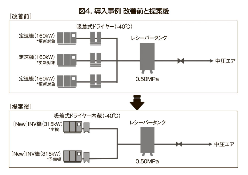 この測定結果から、定速機3台をプレミアム効率315キロワットインバータースクリューコンプレッサー一台に入れ替えることを提案した。さらに、後段に設置されていたドライヤーを、排熱利用吸着式ドライヤーに更新することを提案した(図4)。