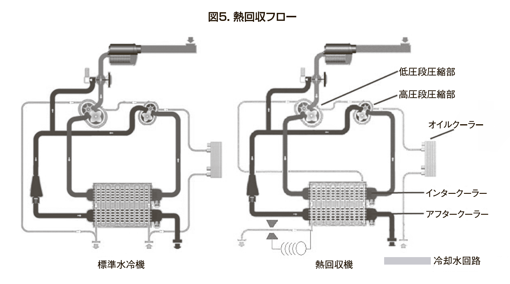 一方で熱回収オプションを搭載した水冷式コンプレッサーは、より高温の温水を回収するために、機内での分岐はせずに、潤滑油の冷却を優先し、その後圧縮部を経由して最後にインタークーラー、アフタークーラーから熱を回収する仕組みとなっている(図5)。