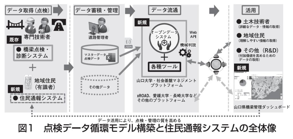SIPにおける取り組みの一環として、地方自治体での維持管理の効率化・高度化を目的とした点検データ循環モデルの構築と住民通報システムへの展開を実施している。本テーマは「社会基盤マネジメントプラットフォーム(インフラデータ管理・流通システム)」と「住民通報システム」の開発を行うことにより、点検データの有機的な活用を実現し、質の高いデータ蓄積を可能とする。これとともに、インフラマネジメントのスパイラル的な高度化を目指す(図1)。
