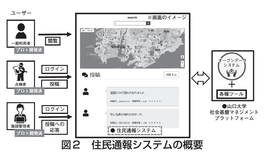 住民通報システムは地域住民が対象施設の損傷を施設管理者へ通報する、もしくは損傷の確認を可能とすることを主とする(図2)。同システムのユーザーは一般住民、メンテナンスエキスパート(ME)などの施設に関する知識を持つ者、施設管理者を想定している。特にMEの活動をさらに活性化させることを開発の目的としており、MEを起点とするヒューマンリソースの戦略的な活用を指向している。