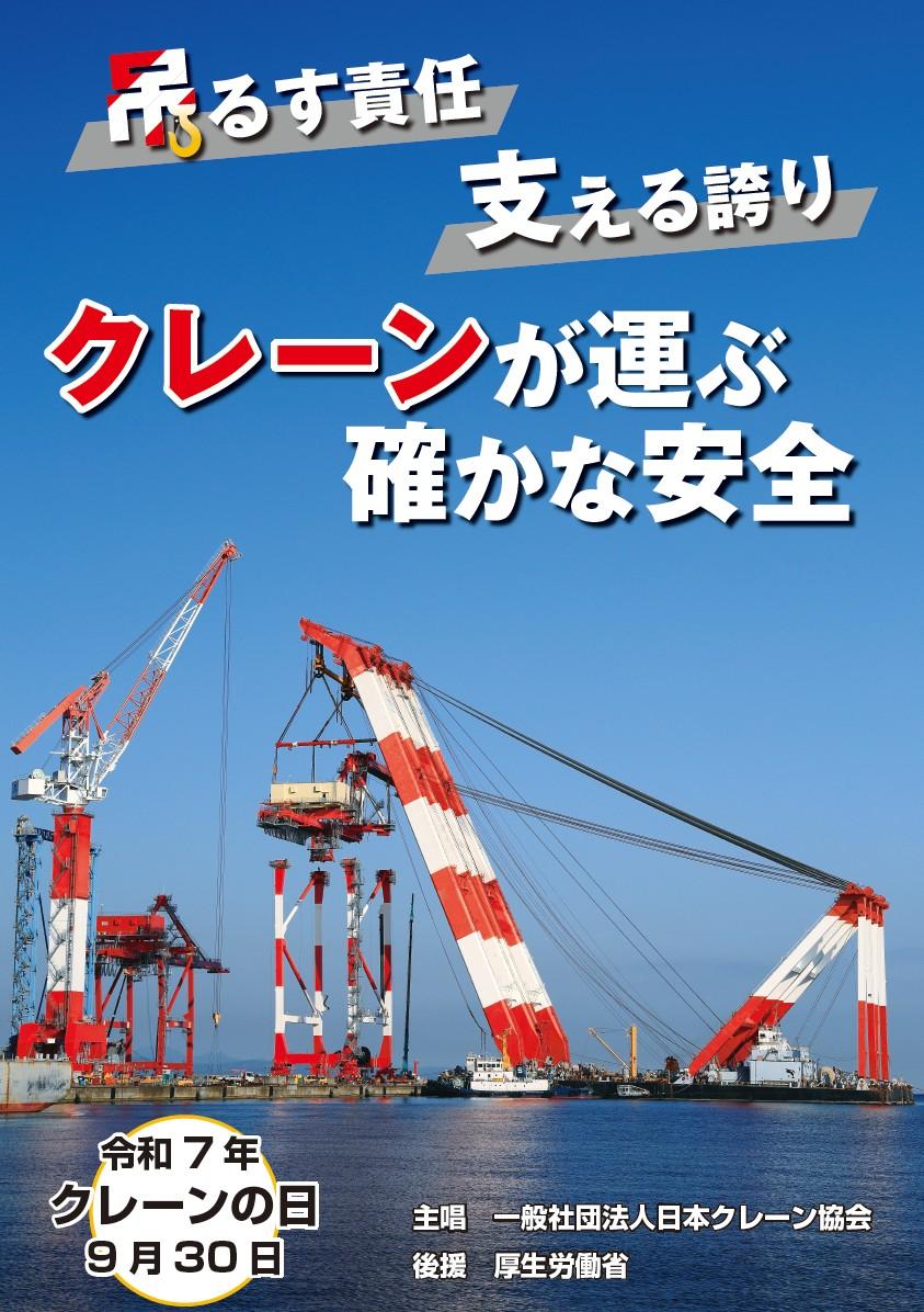 今年の日本クレーン協会の標語は「吊るす責任 支える誇り クレーンが運ぶ確かな安全」を選び、ガントリークレーン建設の現場で活躍する大型クレーン船の写真を採用した(写真)。