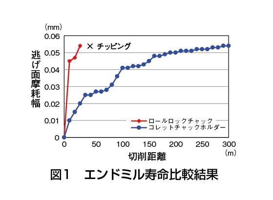 超硬エンドミルを用いて被削材「NAK80」の側面切削を、振れ精度16マイクロメートルのロールロックチャックと振れ精度3マイクロメートルのコレットチャックホルダーで行い、寿命を比較した。比較方法は、切削距離10メートルごとにエンドミル刃先の逃げ面の摩耗幅をマイクロスコープで測定した。エンドミルの寿命は再研削の目安である逃げ面の摩耗幅が0・1ミリ-0・15ミリメートルとした。