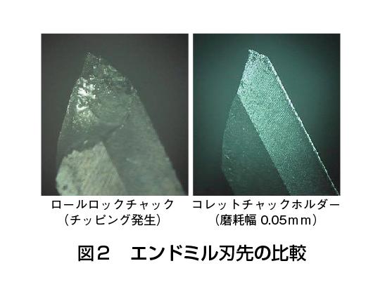 図1、図2に結果を示す。ロールロックチャックは切削距離30メートルでチッピングが発生し、寿命に到達。コレットチャックホルダーは準備した材料(切削距離約300メートル)をすべて加工し終えても、逃げ面の摩耗幅はわずか0・05ミリメートルだった。チッピングも見られず、寿命にはまだ十分な余裕がある結果となった。