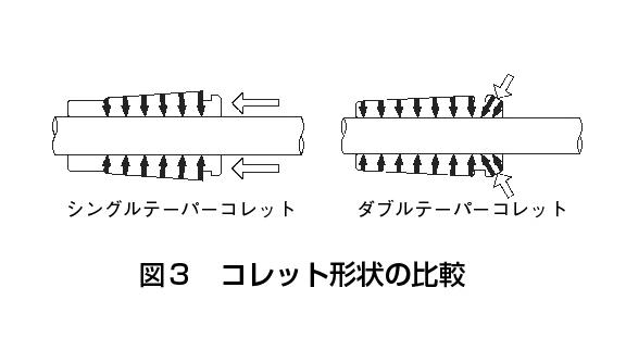 さらにコレットホルダーでもっとも重視すべき点は、把握力の大小だけでなくコレットの口元に把握力があるかどうかだ。ツーリングコレットにはシングルテーパーとダブルテーパーがあり、ダブルテーパーの方がナットの推力(図3、白矢印)を刃先に近い口元で把握力に変換しているため、刃物の抜けが発生しにくい。