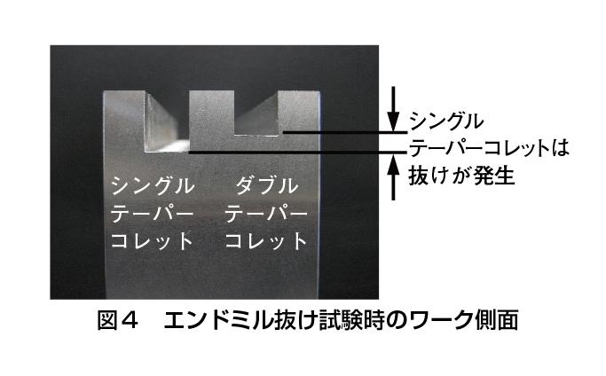 当社はコレット構造の違いによる工具抜けの検証を行った。切削抵抗を大きくするため4枚刃エンドミルを使用し、被削材「A2017」の溝加工を行った。切削条件を上げていったところ、ダブルテーパーは抜けが発生しなかったが、シングルテーパーは加工途中からエンドミルに抜けが発生した(図4)。