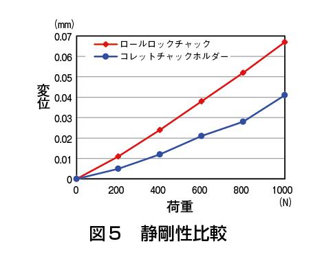 ツールホルダーにチャッキングしたテストバー先端に、荷重を加えて変位を計り、静剛性を比較した。その結果、一般的に高い剛性を持つとされているロールロックチャックよりコレットチャックホルダーの剛性が上回った(図5)。