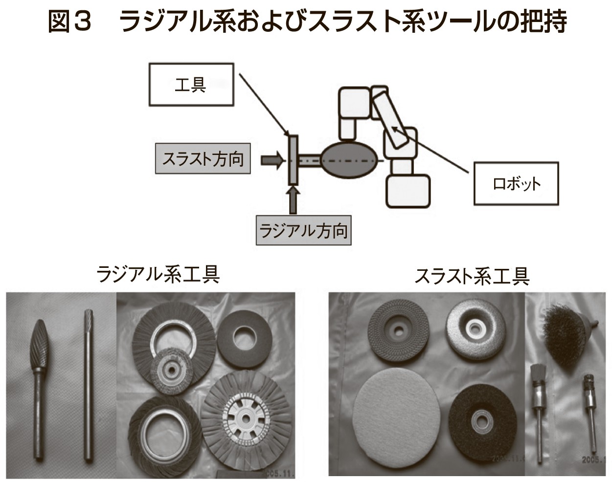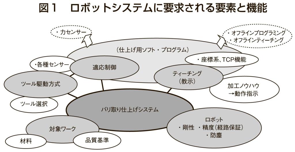 図1に示した絶対位置加工におけるロボットを導入する際は、必要な剛性、位置決め精度および経路保証精度などを選定する。ツール駆動装置としては、バリ取り・エッジ仕上げ作業に必要な動力を持つものを配置すれば、自動システム化が可能になる。そのために必要な技術的ポイントは次の3点になる。