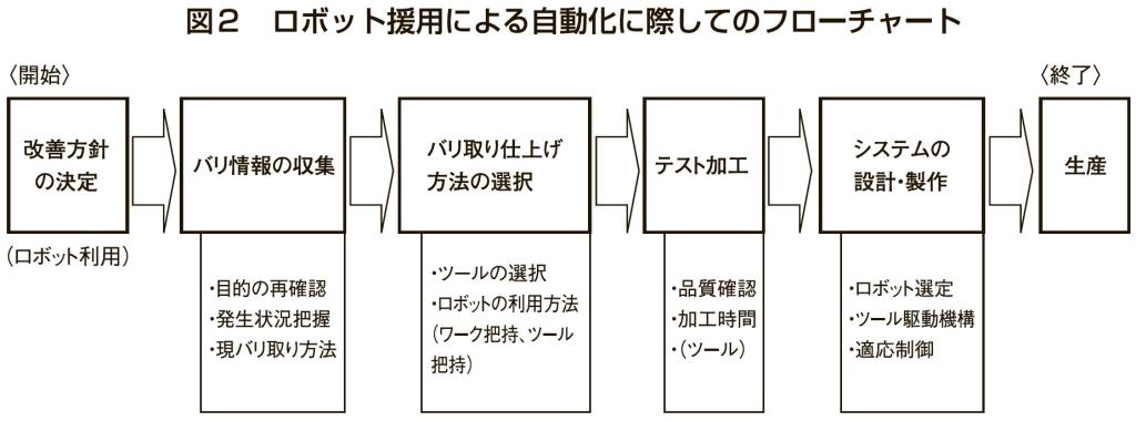 さらに、ロボット以外に図1に示すような、ロボットシステムに要求される要素と機能を十分に考慮した上で、図2のような手順に従ってバリ取り・エッジ仕上げ作業の自動化を行う必要がある。