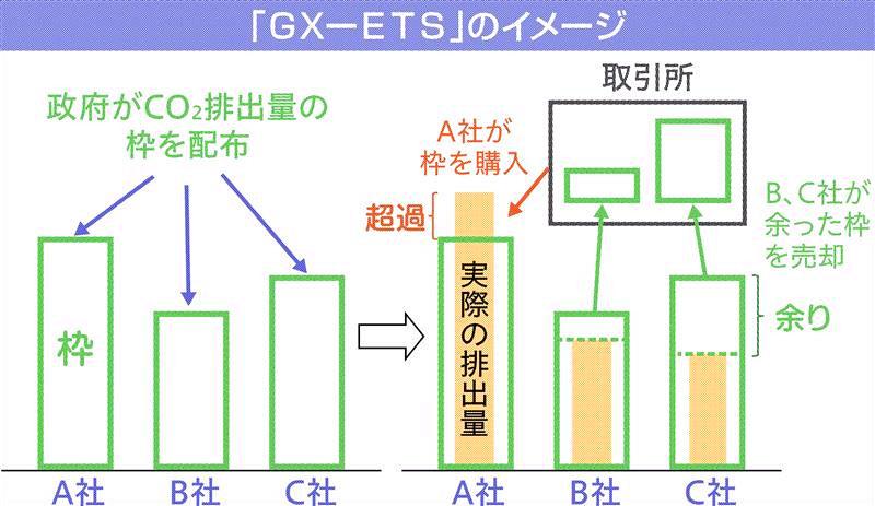 GX—ETSは政府が企業ごとに二酸化炭素(CO2)排出量の上限である「排出枠」を割り当てる。企業が排出量を減らして排出枠が余れば他社に売却できる。一方で、排出枠超過分は取引市場から調達する必要がある。枠の購入が負担となるため、企業に排出削減を促す効果が期待できる。