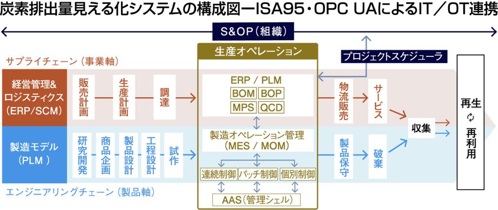 こうした課題に対応するため、北九州高専はIAFの制御層情報連携意見交換会「CLiC」と連携し、製造現場の実態に即した炭素排出量の「見える化」システムを構築した。このシステムは製造オペレーション管理に関する国際標準ISA95(IEC/ISO62264)、通信規格OPC UA(IEC62541)、およびKPI管理基準ISO22400に基づいて設計されている。