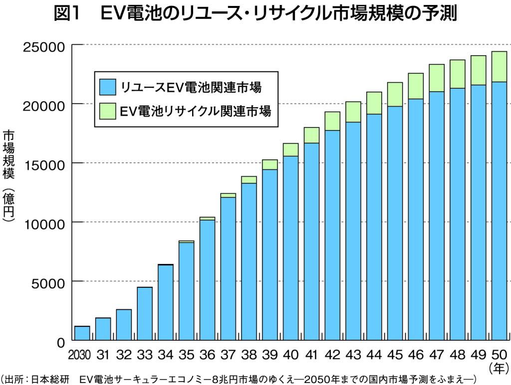 EV電池のサーキュラーエコノミーを国内で形成することは、資源安全保障だけでなくリユース・リサイクル市場を中心とする新たな市場の創出という観点からも重要である。日本総合研究所では国内でEV電池のサーキュラーエコノミーが形成されることにより、2050年にはリユース・リサイクル市場の規模が約2・4兆円に達すると試算しており(図1)、新たなビジネスや技術の創出も期待される。