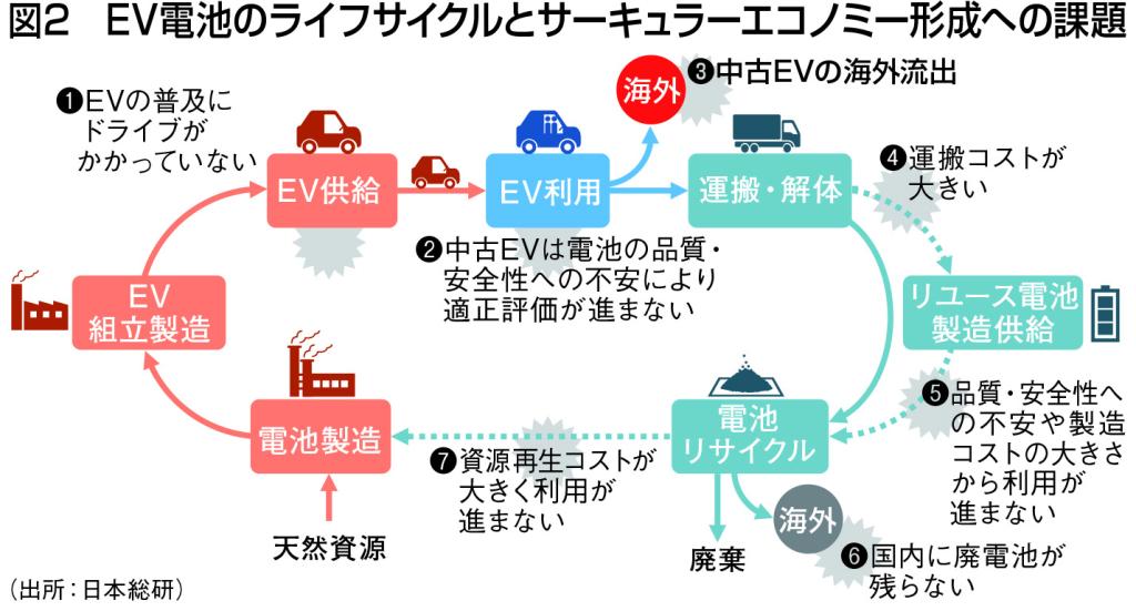 しかし、国内のEV電池のサーキュラーエコノミーは、これまでのところ順調に形成されているとは言い難い。最大の課題はリユース・リサイクルの起点となる中古EVの多くが海外に流出していることにある。中古EVの電池の残存性能や安全性能は見た目には分からないため、中古EVの購入を検討するユーザーは不安を感じ、その結果として中古EVの国内需要が拡大しないと考えられる(図2)。