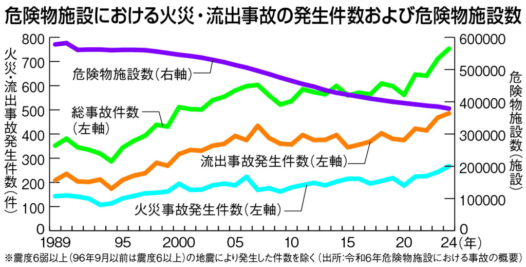 総務省消防庁の「令和6年中の危険物施設に係る事故の概要」によると、2024年の危険物施設(37万9120施設)で発生した火災事故は267件(前年比24件増)、流出事故は486件(前年比18件増)だった。危険物施設数は年々減っているものの、事故発生件数は火災・流出ともに増加傾向にある。