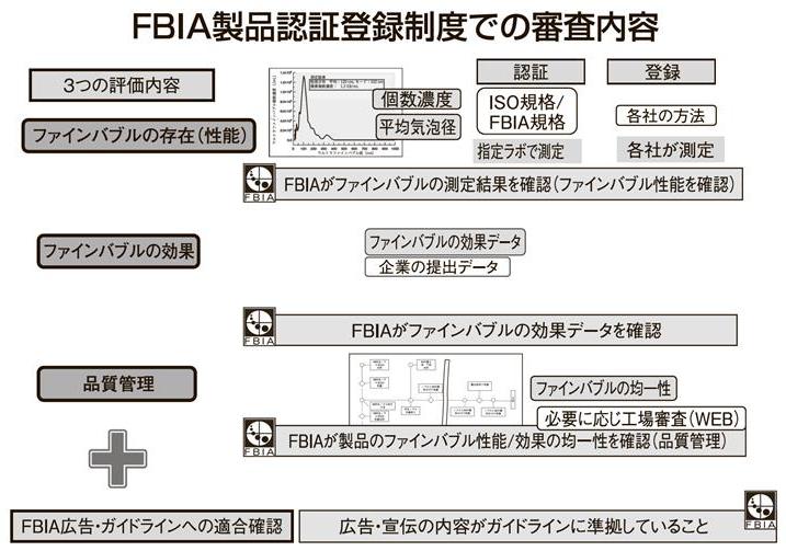 FBIAの製品認証登録制度での審査では、①発生性能②ファインバブルの効果③製品の品質管理—の3項目を評価する。