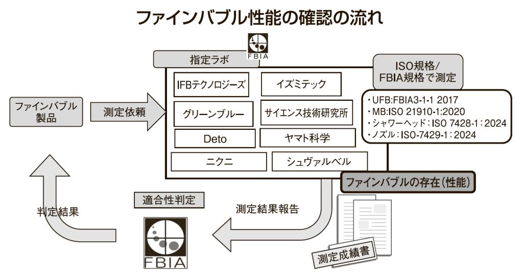 ①発生性能の確認では、ISO規格とFBIA規格に基づいた測定方法により、認証製品のファインバブル平均気泡径と個数濃度を測定する。測定はFBIAが指定する試験ラボで行える。FBIAはその結果を基にファインバブルの特性(個数濃度、粒径)と測定方法を確認し、製品に必要とされるファインバブルの存在を総合的に判定して、認証の可否を決定する。