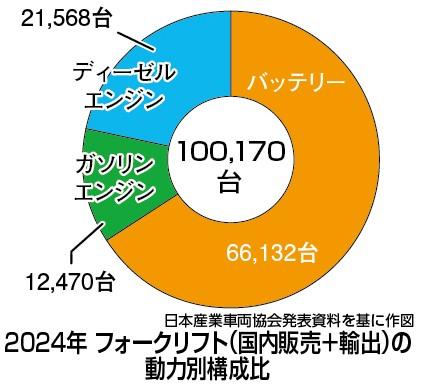 日本産業車両協会の調べによると、2024年のフォークリフトの国内販売と輸出の合計台数は10万170台で、バッテリー式の割合は66%、ガソリン式12・5%、ディーゼル式21・5%だった。バッテリー式の比率は1994年が33%、2004年36%、14年43%と、フォークリフトの動力はバッテリー式へのシフトが進んでいる。バッテリー式は排ガスが出ず、音も静かなため、工場や倉庫、物流施設といった建屋内での作業が多い現場で好まれる。また、構内で使用する場合は、充電設備への不安もない。
