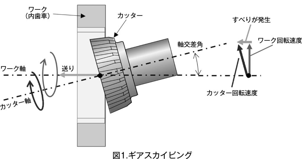 ギアスカイビングとは、多数の切れ刃を有するスカイビングカッターに軸交差角を与え、カッターと加工対象物(ワーク)を歯数比に対応した回転数で高速同期回転させながら、カッターにワーク軸方向の切削送りを与えて加工する方法で、軸交差角分の傾きによるすべりを発生させて創成加工を行う加工法である(図1)。
