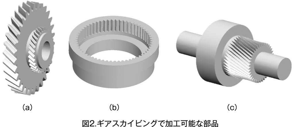 カッターに与える軸交差角を小さく設計することで、カッターの抜け代を小さく出来る。このため、内歯車、外歯車を問わず止まり穴や壁に隣接する歯車の加工が可能となる(図2 a、b)。ギアシェーパーに依存していた工程から、より生産性の高いギアスカイビング工法への切り替えが可能となる。
