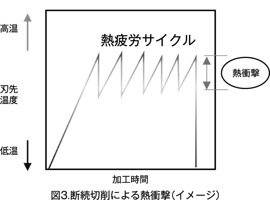 しかしギアスカイビング加工は断続切削となるため、カッター刃先は図3に示すように非常に速いサイクルで加熱と急冷を経験する熱衝撃を受け、表面のコーティング膜に亀裂が発生する。ここを起点としてコーティングの剝離、母材摩耗が進行するのが刃具寿命を悪化させるメカニズムである。