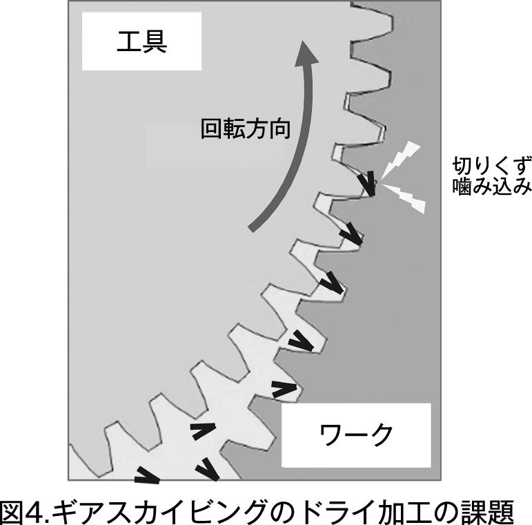 しかしドライ加工には二つの課題がある。一つ目に、内歯車の加工では加工中に発生した切りくずが遠心力によりワーク内径に張り付くためカッターとワークの間に切りくずの噛み込みが発生する(図4)。ワーク歯面の傷や、カッターの欠損につながってしまうため、これまで採用が困難であった。二つ目に、ドライ加工環境下ではカッターにさらなる耐熱性、耐摩耗性が求められる。