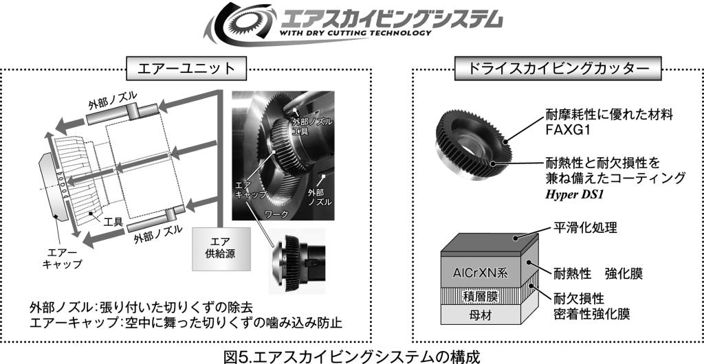 エアーユニットはワーク内径に張り付いた切りくずを除去する「外部ノズル」と、ワークとカッター間の切りくず噛み込みを防止する「エアーキャップ」で構成する。ドライスカイビングカッタは耐摩耗性を重視した材料と、過酷なドライ環境下に耐えられる新開発の「Hyper DS1」 コーティングを採用した。表層は平滑化処理をすることで切りくずの溶着を抑制する。これらによりギアスカイビングのドライ加工を実現し刃具寿命の課題を解決した。