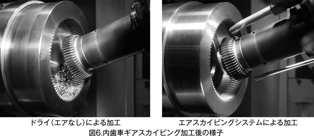 同システムによる内歯車加工後の様子を図6に示す。最適なエアを噴射せずにドライ加工した場合、切りくずがワーク奥側に堆積し、切りくず噛み込みのリスクが非常に大きくなる。一方でエアスカイビングシステムによる加工では、ワーク内の切りくずを瞬時に排出し、噛み込みを防止することが可能となる。