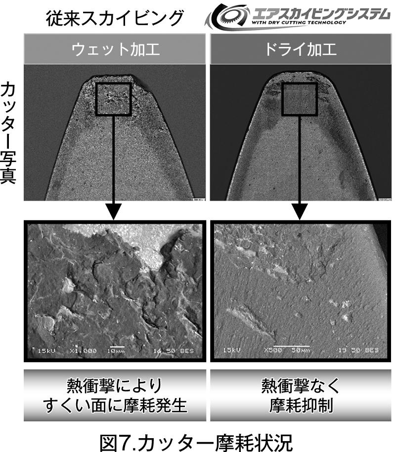 同システムにより、合金鋼「SCM420」材を加工した際のカッター摩耗状況を図7に、寿命向上効果を図8に示す。従来のウエット加工では熱衝撃によるコーティング膜の亀裂を起点とした工具刃先の摩耗が進行しているのに対して、ドライ加工では膜の亀裂発生が抑制され、カッター寿命が5倍以上に向上した。