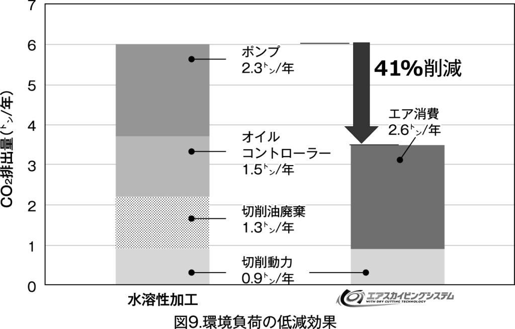 従来のクーラント加工に必要な中圧クーラントポンプ、オイルコントローラーの電力および油剤の廃棄に関わる二酸化炭素(CO2)排出量が削減できる。エアの消費による増加分を考慮しても、加工設備全体では従来比41%のCO2低減の効果が期待できる(図9)。
