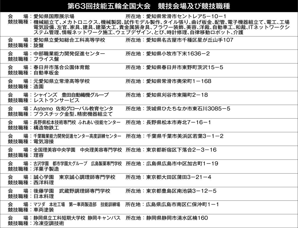 技能五輪全国大会は23歳以下の若手技能者を対象とした技能競技大会。地方予選などを勝ち上がった23歳以下の若手技能者が日頃の鍛錬の成果を競い合う。厚生労働省と愛知県、中央職業能力開発協会(JAVADA)が主催し、23年から国際大会前年の27年まで5年連続同県での開催が決定している。愛知県国際展示場を主会場に、元愛知県立常滑高等学校(愛知県常滑市)、愛知県立愛知総合工科高等学校(名古屋市千種区)、中部職業能力開発促進センター(愛知県小牧市、ポリテクセンター中部)、春日井市落合公園体育館(同春日井市)、豊田自動織機の福利厚生施設シャインズ(同刈谷市)の県内6会場を中心に全国15会場で熱い戦いが繰り広げられる。
