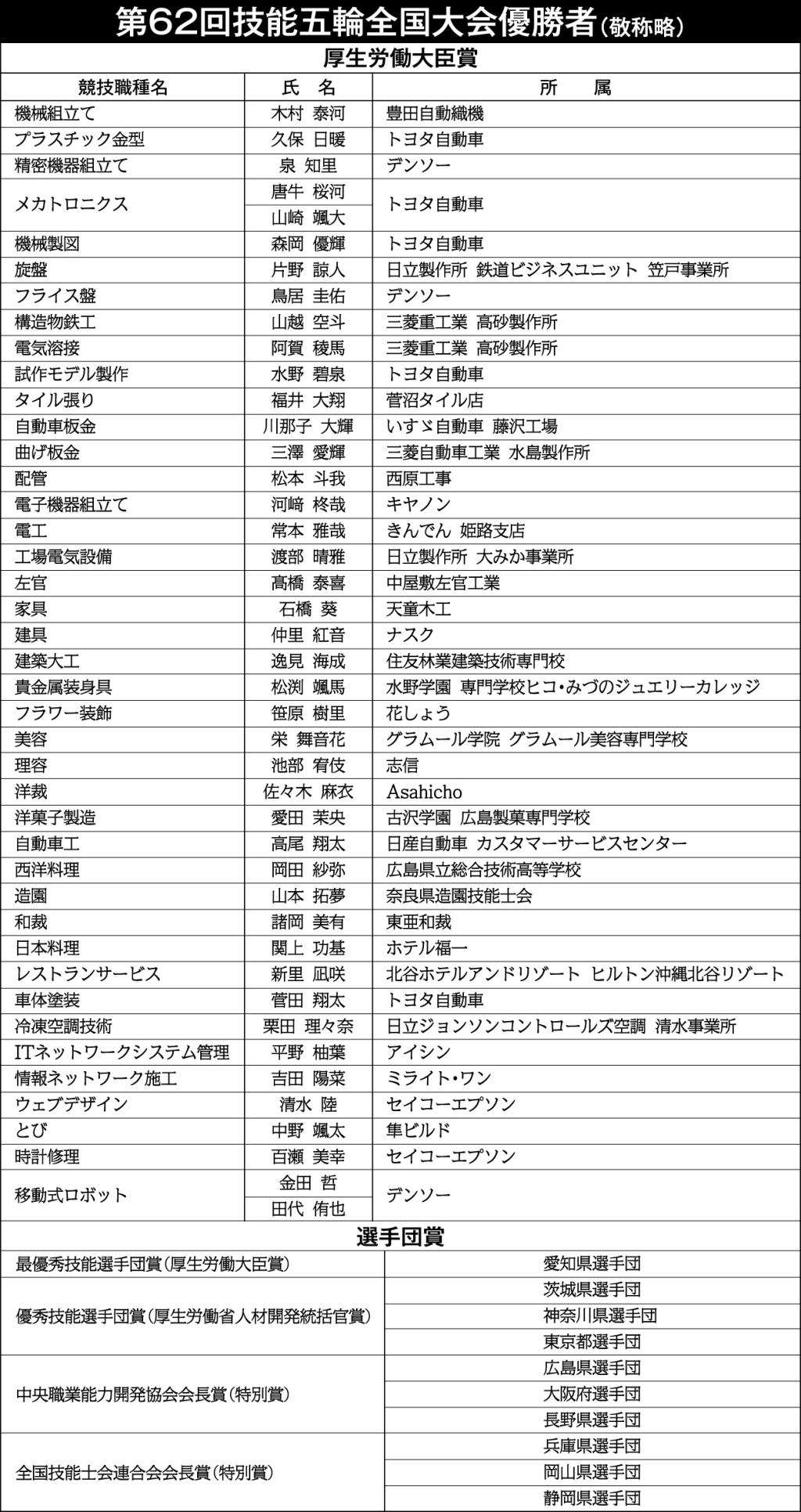 開催地となった愛知県は、20年連続で最優秀技能選手団賞の受賞。自動車関連企業を中心に、31職種に191人が出場した。金賞はトヨタ自動車が23連覇を達成した「試作モデル製作」や、「移動式ロボット」「フライス盤」をはじめ11職種で13人が金メダルを獲得。25職種90人が入賞した。自動車メーカーを中心に選手育成がされてきた同県だが、前回大会では「タイル張り」で金メダル、「和裁」「建具」でも3位内入賞など多彩なモノづくり技術が評価された。表彰式で愛知県の大村秀章知事は「選手の皆さんは、今回の努力を糧に、次なる目標に向けて発展を期待する。日本を引っ張る技能者として、さらに研さんを積み、後進を育ててほしい」とエールを送った。