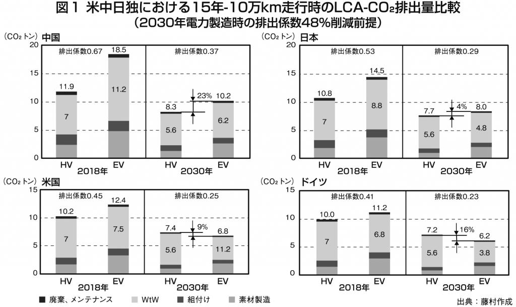 ゼロエミッション車(ZEV)規制(米国カリフォルニア)や新エネルギー車(NEV)規制(中国)におけるEVなどの車種規制は、ユーザーの負担を軽視していると言わざるを得ない。ウェル・トゥ・ホイール(WtW、燃料採掘から車両走行まで)評価やライフサイクルアセスメント(LCA)評価でCO2をカウントすれば、電力の排出係数によってはHVのCO2排出量がEVよりも少ないこともようやく周知、浸透してきた(図1)。単なるEVの拡大はCO2削減の救世主にはなり得ない。