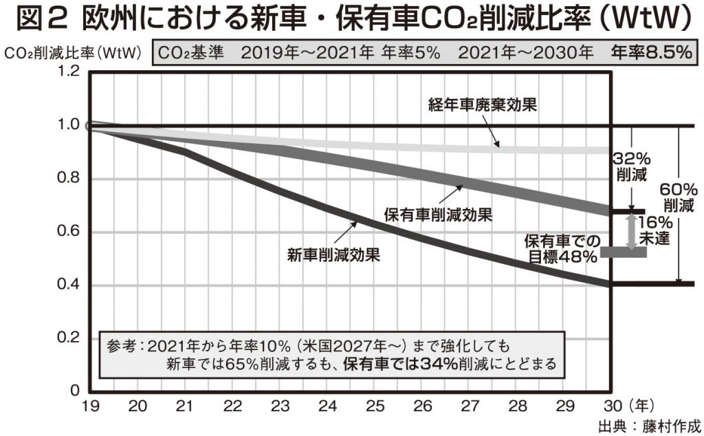 これこそが、新車だけでなく既販車のCO2削減が必須な理由である。参考までに日本の年率3・5%の燃費基準では25%未達で、CO2規制として年率8%程度までの強化が欠かせない。