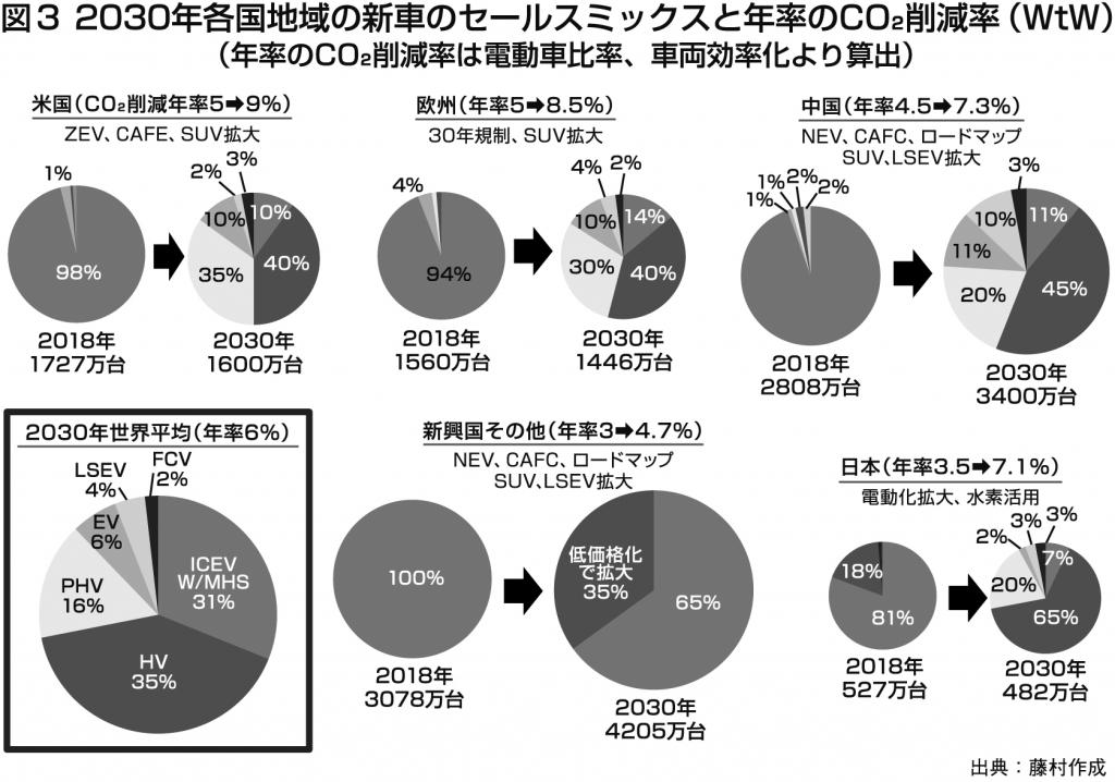 新車に対し先進国は年率8%前後、新興国は年率5%程度の厳しい規制を課し、自動車メーカーは規制に適合すべく車両軽量やシステム改良、電動車拡大を進めなければならない(図3)。厳しくても対応しなければ、結果的に削減目標を達成できず、自動車の生産はできなくなる。