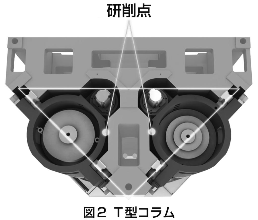 2頭の高強度なスピンドルを搭載するにあたり、最適なコラム形状を考案した(図2)。2頭のスピンドルを横並びに置いた構造では、スピンドルの自重による偏荷重を支えられる強度のある構造にする必要があることや、二つのスピンドル間の距離が広がるため、ウエハーを保持する3チャックを載せたロータリーテーブルが必然的に大きくなり、設備のコストアップや変位量の悪化が考えられた。T型コラム形状にすることでコラムの外周からなる三角形の内側にスピンドルを配置することができ、スピンドルの自重によるコラムの変位を抑えることができた。