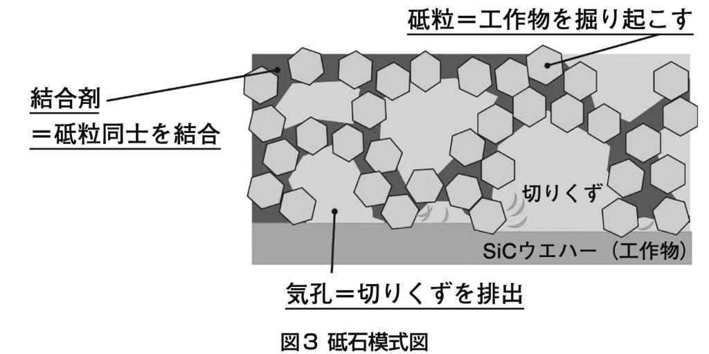 研削砥石の結合剤であるビトリファイドボンドの模式図を図3に示す。砥粒の切れ味を維持するためには適度に自生発刃することが必要である。この自生発刃の頻度、量を制御するには砥石の構成要素である「砥粒」「結合剤」「気孔」の割合や分散性の調整が必要である。