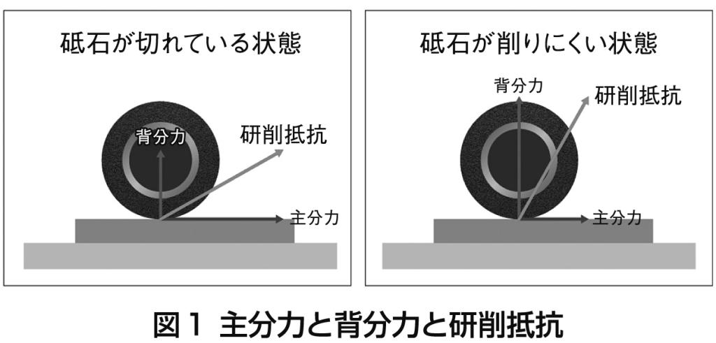 成形平面研削盤の場合、主分力は砥石の接線方向、背分力は砥石の法線方向にかかる力である。砥石が切れている状態では主分力が大きくなり、切れ味が悪くなると背分力が大きくなる傾向にある(材質と使用砥石によって傾向が変わることもある)。検出された主分力と背分力の比率から、総合的な研削抵抗を求めることができる(図1)。